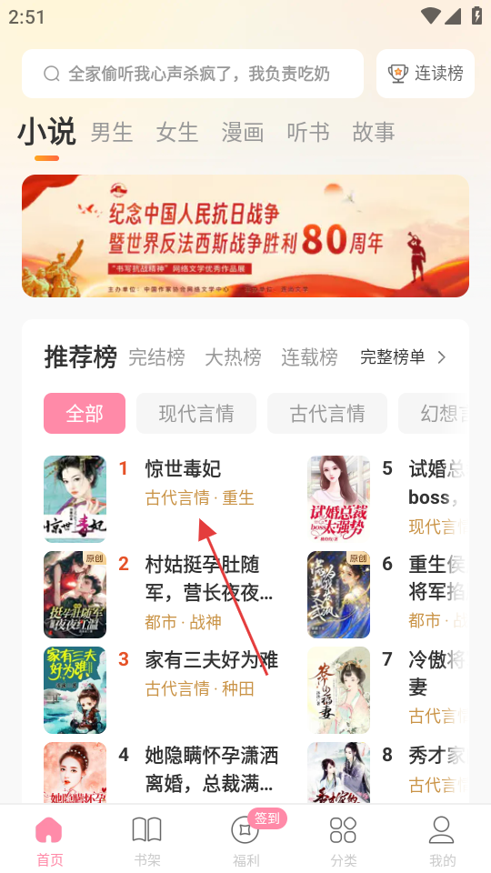 1、在首页推荐榜中,点击惊世毒妃,进入小说阅读页面。