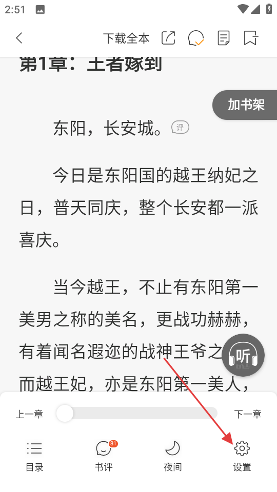 3、调整阅读设置:根据需求点击设置按钮,自定义字体大小、背景颜色等参数,同时可在多设备登录同步过往阅读进度。