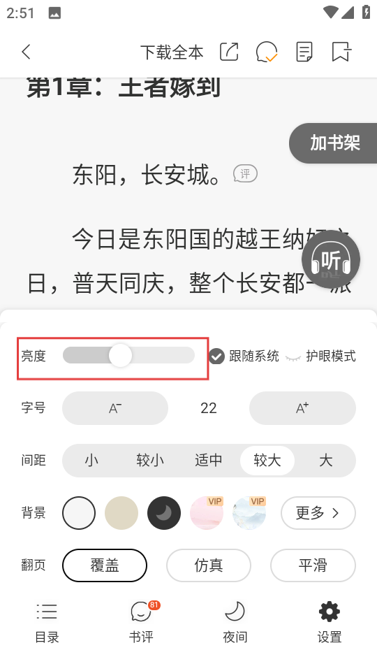 4、在设置界面,拖动亮度滑块,调整阅读页面亮度。