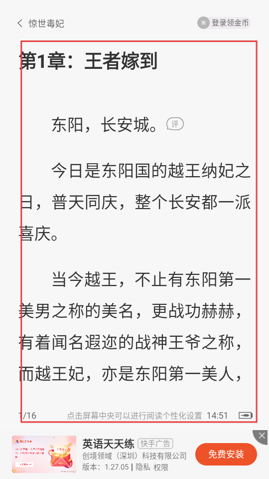 2、进入后,可阅读第一章内容,点击屏幕唤起菜单功能。