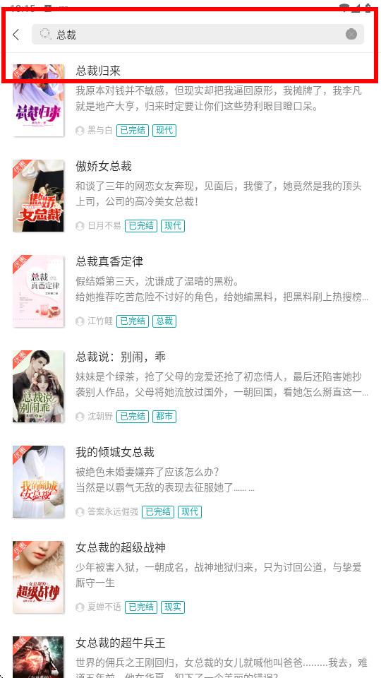3、在弹出的搜索框中输入想要查找的书籍关键词如总裁,输入完成后即可显示相关书籍列表,点击对应书籍就能查看阅读。