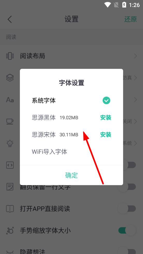 3、在弹出的字体设置窗口里,可看到系统字体及其他字体选项,点击想要的字体安装完成后确定,即可设置新字体样式。