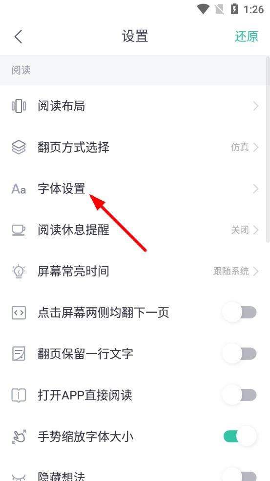 2、在设置页面中,找到阅读板块,点击其中的字体设置选项。