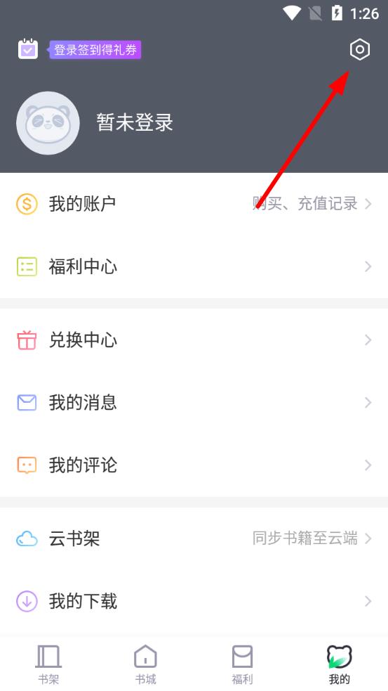 1、打开熊猫看书APP,点击底部导航栏的我的,进入个人界面后,点击右上角设置图标。