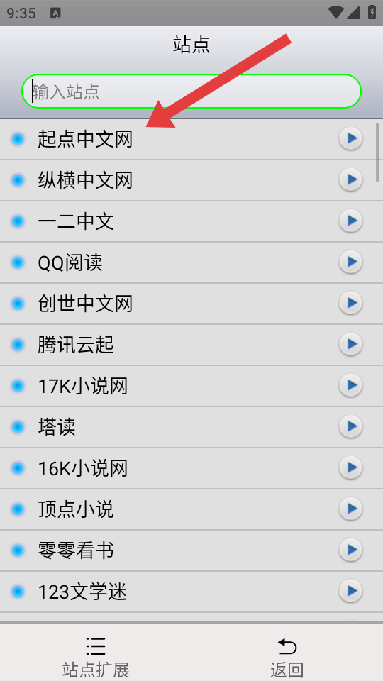 2、在站点界面,可直接选择已有站点如起点中文网等,点击站点名称进入相关设置。
