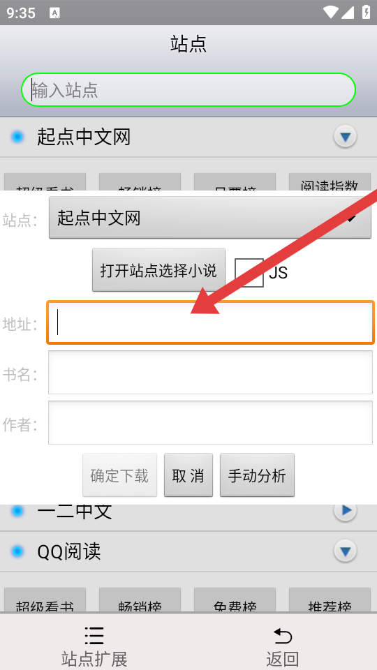 3、若需添加自定义站点,在站点的地址输入框中,粘贴书源链接,完成后可进行下载或阅读等操作,从而添加新站点。