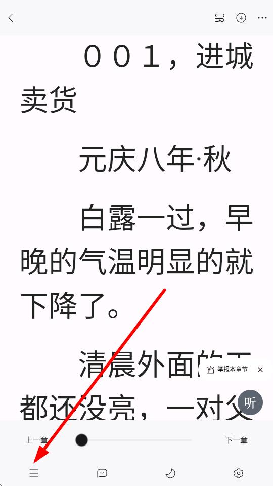 2、在小说阅读界面,点击左下角三条横线样式的按钮弹出目录。