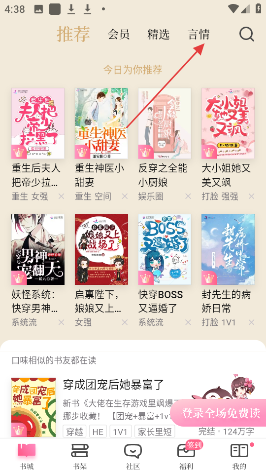 1、打开红袖添香,在首页点击顶部的言情选项。