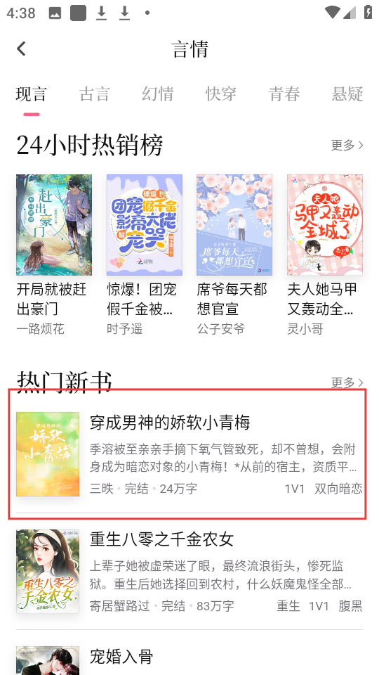 3、在现言列表下,选择穿成男神的娇软小青梅。