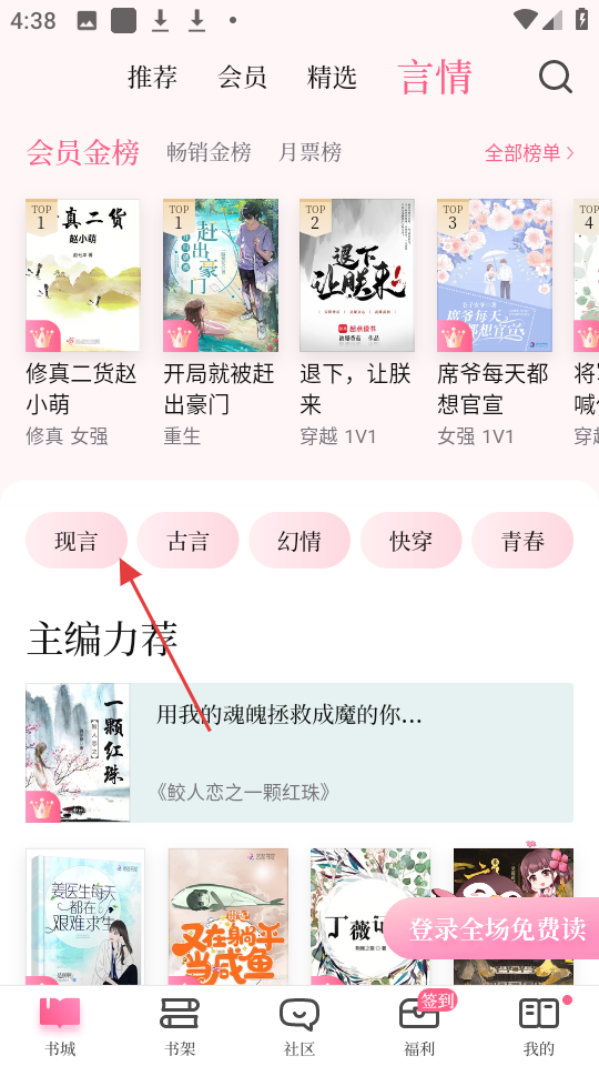 2、进入言情页面后,点击现言分类,进入现言列表。