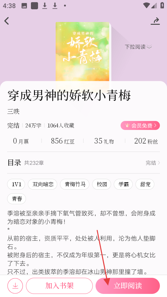 4、进入穿成男神的娇软小青梅详情页后,点击立即阅读。