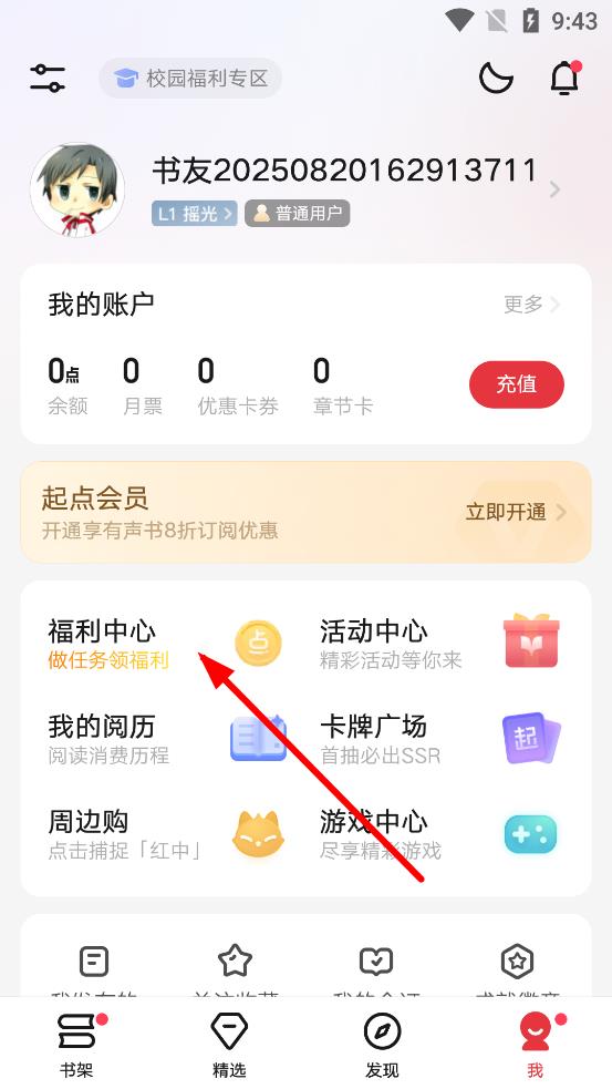 1、打开起点读书APP,点击底部导航栏最右侧我,进入个人中心页面,点击福利中心做任务领福利。