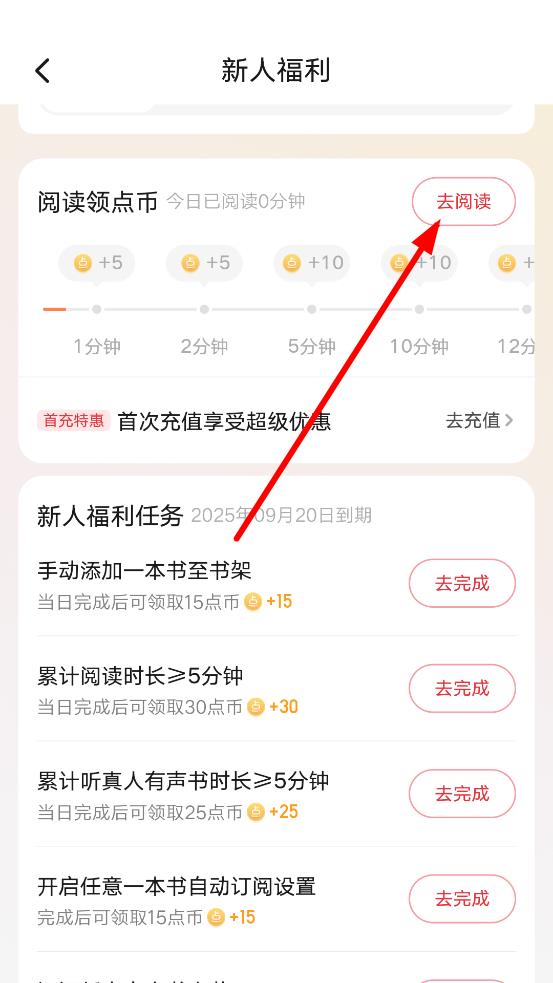 3、找到阅读领点币板块,点击去阅读,按要求完成阅读时长任务,即可领取对应点币,完成后领取点币奖励。