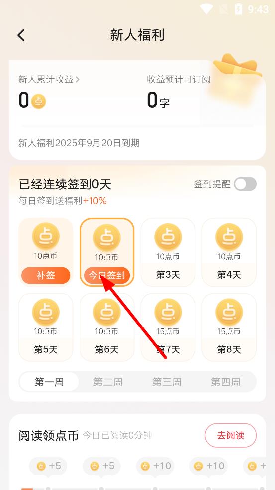 2、进入新人福利界面后,点击今日签到,每日签到可获得相应点币,连续签到天数越多,部分天数奖励的点币也会增加。