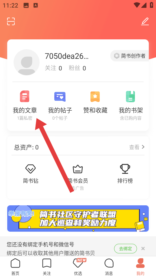 1、在简书我的页面,点击我的文章选项,进入我的文章的界面。