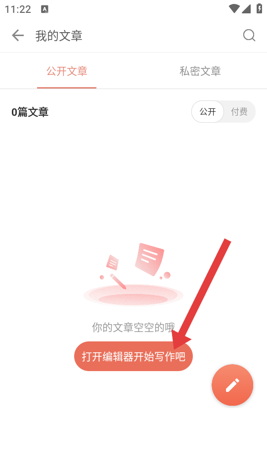 2、在我的文章界面,点击打开编辑器开始写作吧按钮,进入文章编辑页面。