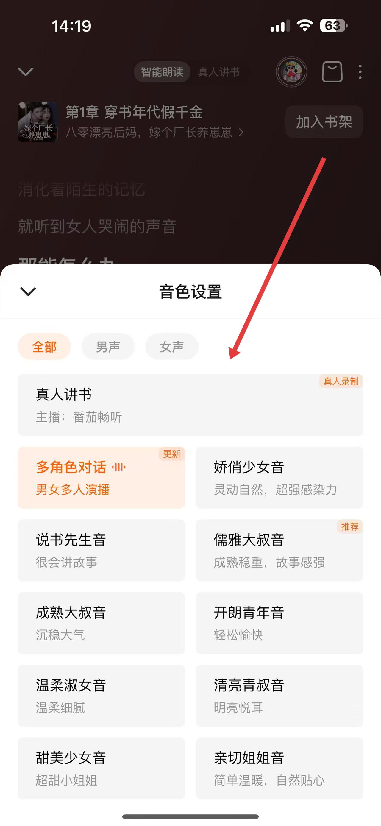 3、点击后会弹出音色设置界面,在该界面中可选择真人讲书、多角色对话等多种音色,点击想要的音色即可完成声音更改。