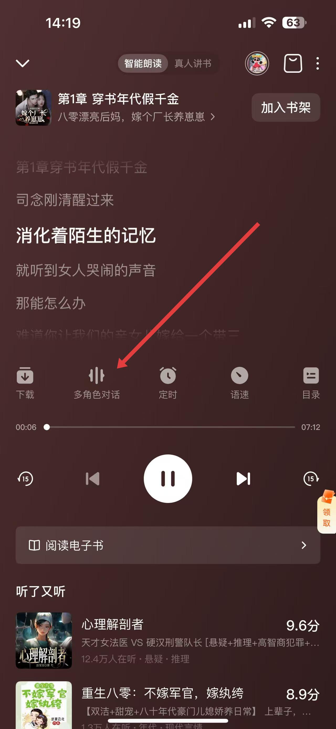 2、在听书播放界面中,点击多角色对话选项,该选项在下载和定时按钮之间。