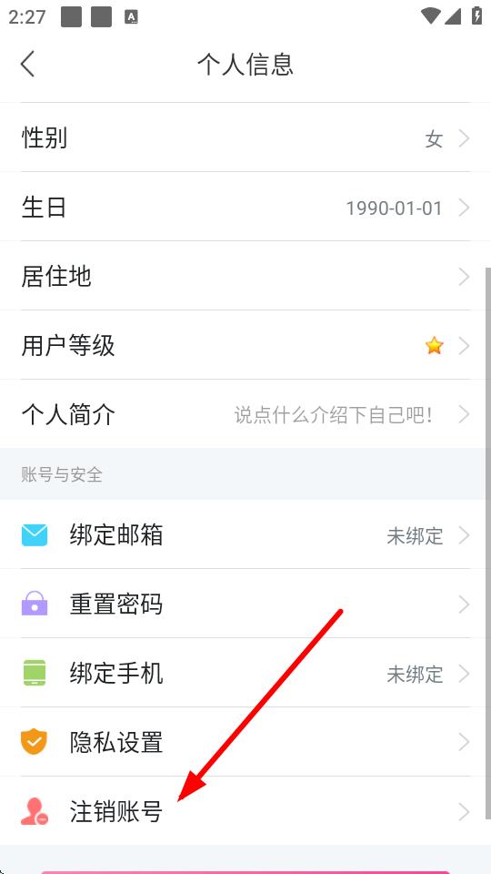 3、在个人信息详情页里,向下滑动屏幕,找到注销账号选项并点击。