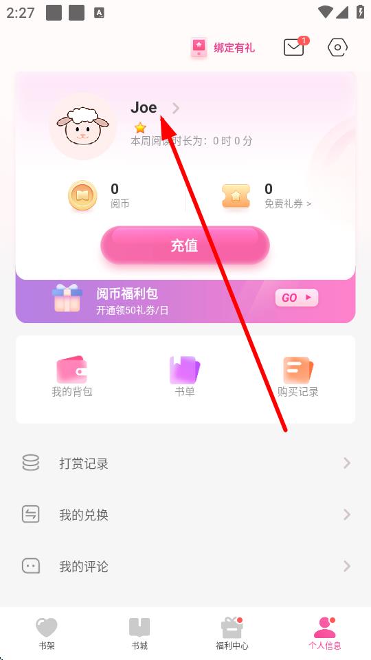 1、打开安卓读书app,点击底部导航栏最右侧的个人信息选项。
