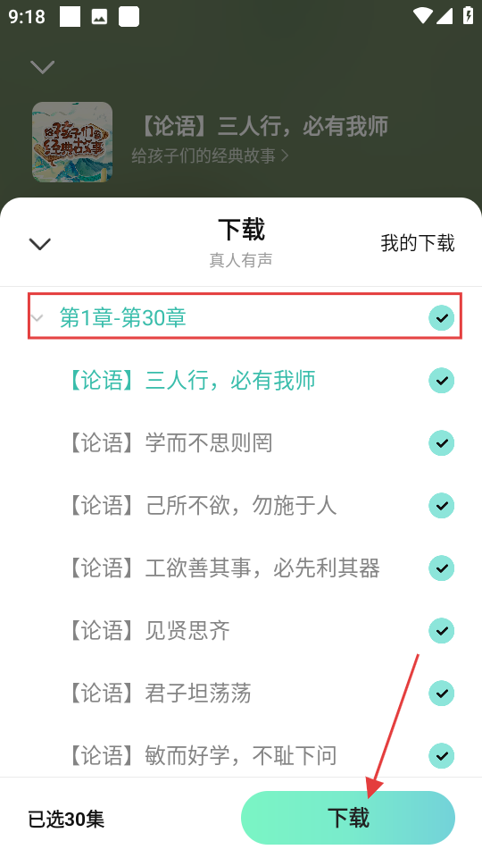 4、在下载选择页面,勾选第1章-第30章,点击下载按钮,即可下载所选章节。
