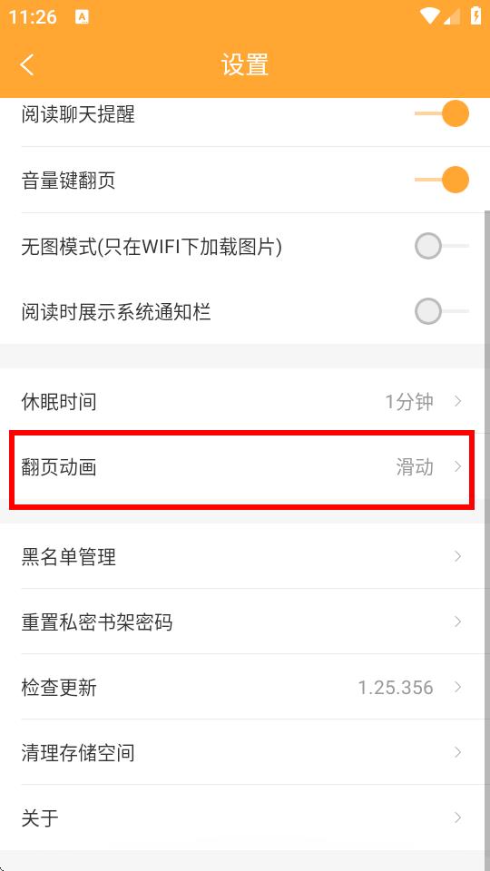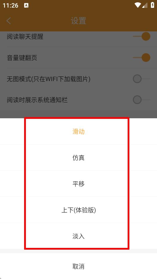 4、在弹出的翻页模式选择框中,有滑动,仿真,平移,上下,淡入等模式,点击选择自己喜欢的翻页模式即可完成设置。