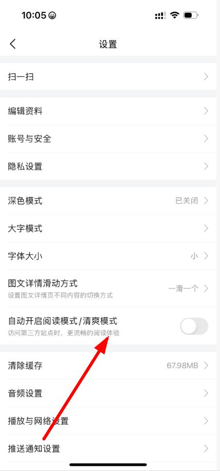 2、在设置页面中,找到自动开启阅读模式/清爽模式选项。