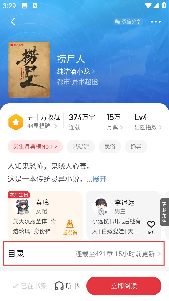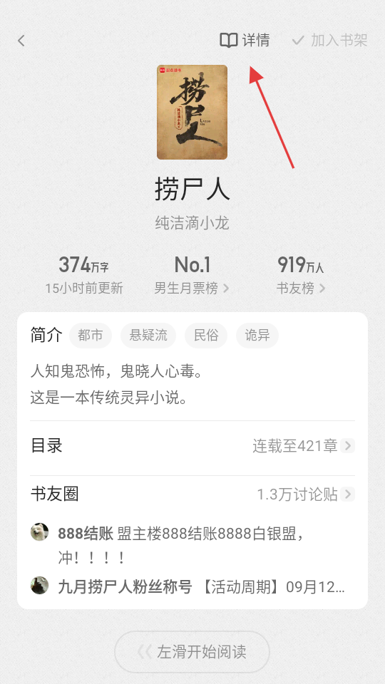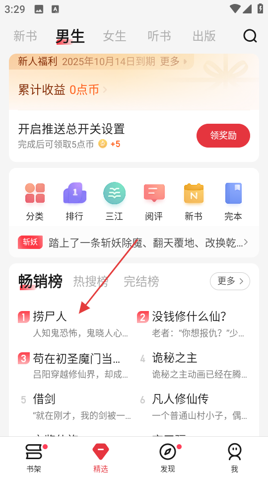 1、在精选页面的畅销榜中,点击捞尸人,进入书籍详情页。