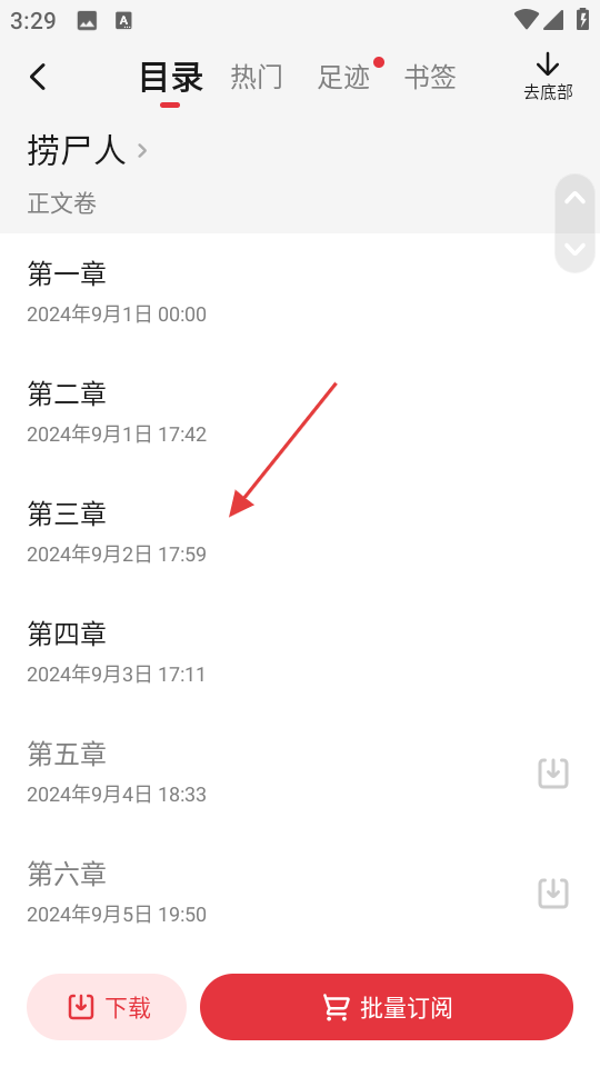 4、在目录页面,可选择具体章节,如第三章进行阅读。