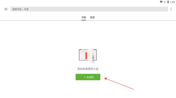 1.打开轻阅小说应用程序,此时默认显示的书架页面通常空空如也,下方有醒目的绿色点击该按钮,即可进入添加书本的相关操作环节。