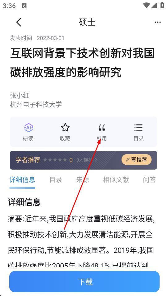 3、在文献详情页里,点击引用选项。