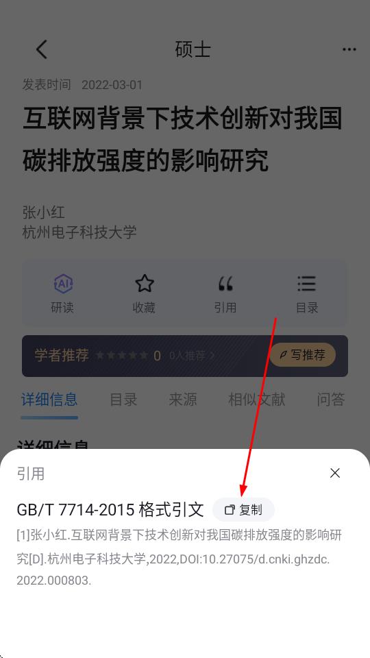 4、在弹出的引用格式界面,选择合适的引用格式,点击复制按钮,即可复制引用内容用于你的文章或报告中。