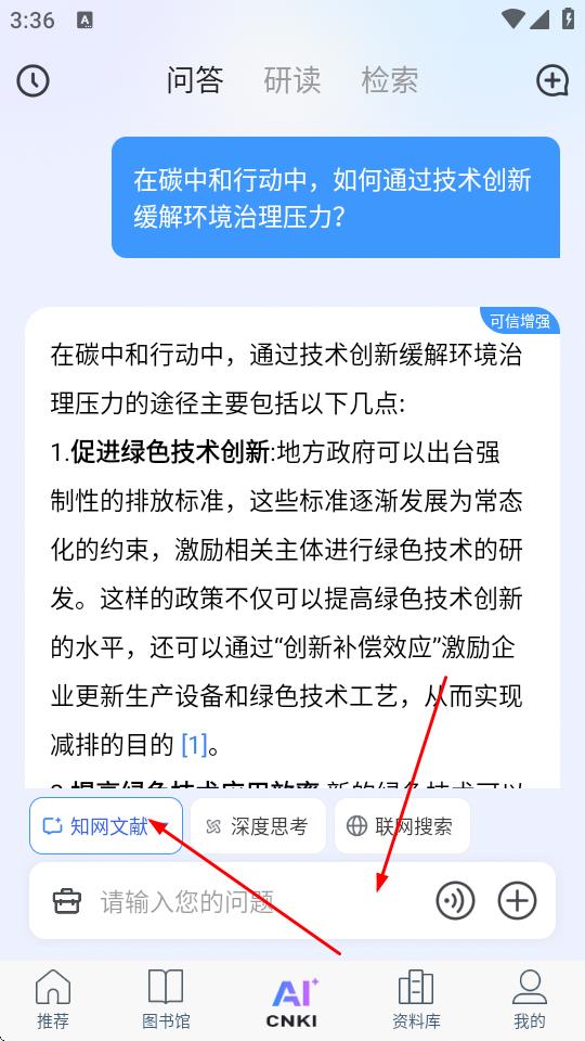 1、打开全球学术快报App,进入AI问答界面,点击知网文献按钮,输入相关问题。