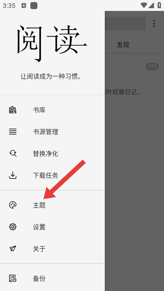 老子搜书怎么恢复主题颜色,按照上面的格式和这四张图片来写,每一张图片对应一个点1、在老子搜书主界面,点击左上角的菜单按钮,展开系统侧边栏。