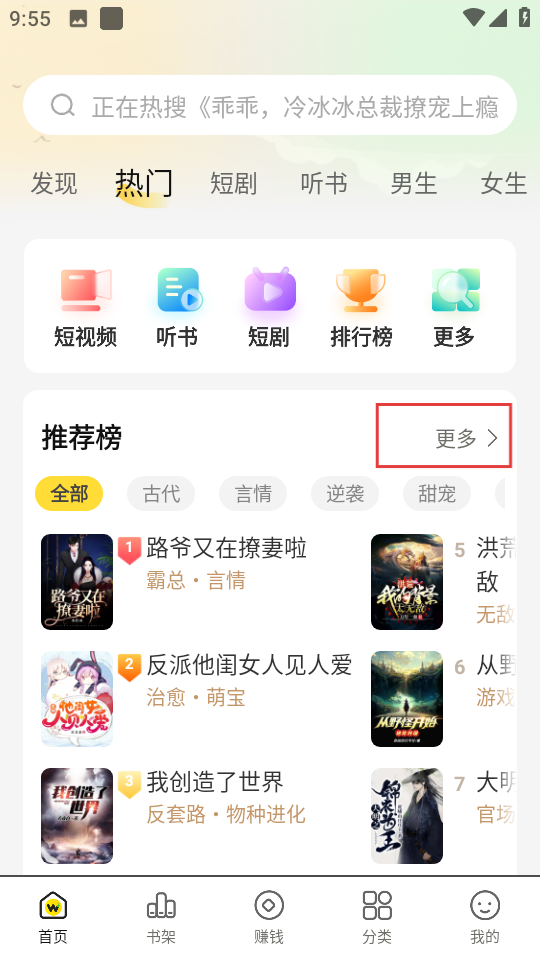 1、点击推荐榜右侧的更多按钮,进入推荐榜完整页面。