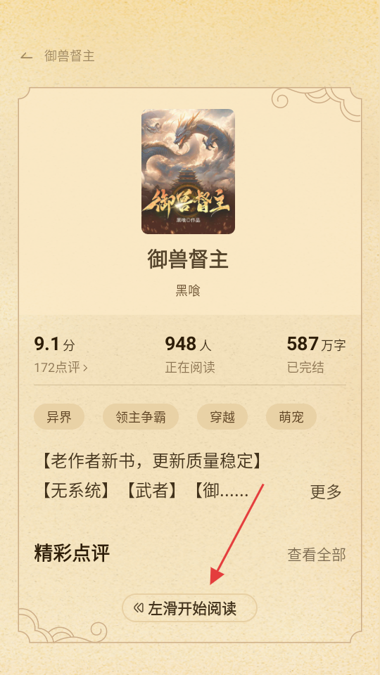 3、在御兽督主详情页,左滑开始阅读,进入阅读页面。