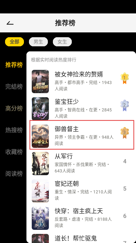 2、在推荐榜完整页面,选择御兽督主,进入该书详情页。