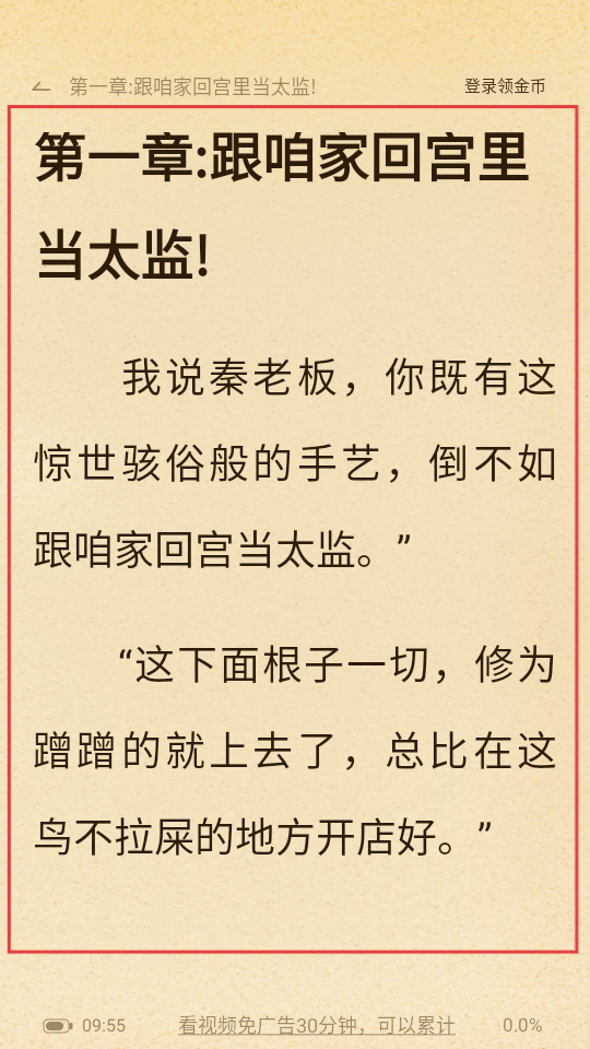 4、在阅读页面,可查看第一章跟咱家回宫里当太监的内容。