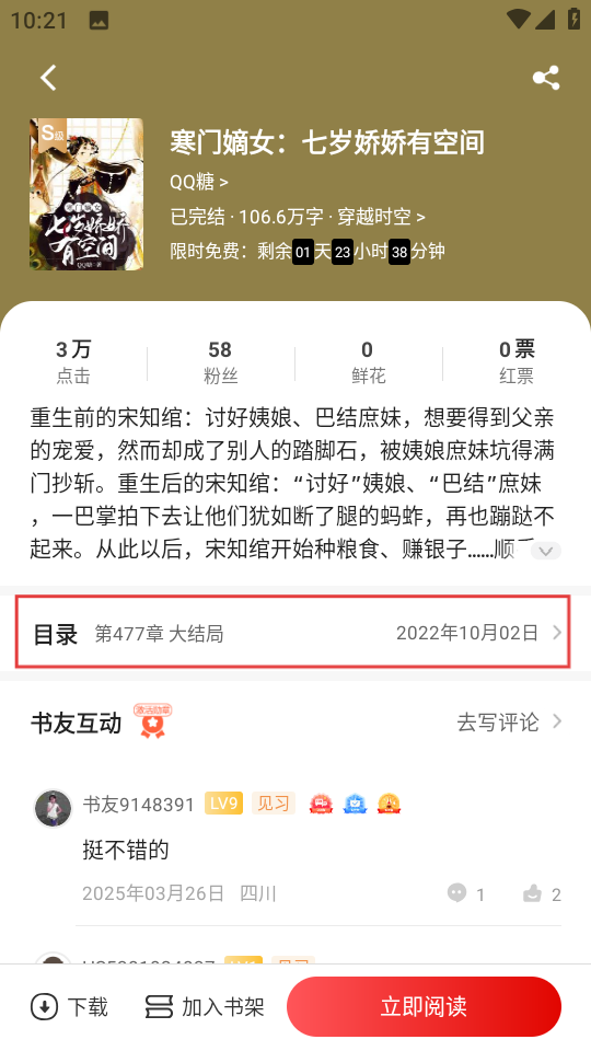 3、进入书籍详情页后,点击目录,查看书籍章节列表。