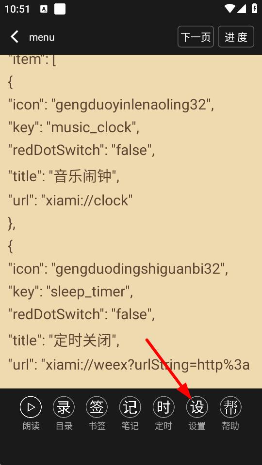 2、在文档阅读界面中,点击屏幕调出底部功能栏,然后点击设置选项。