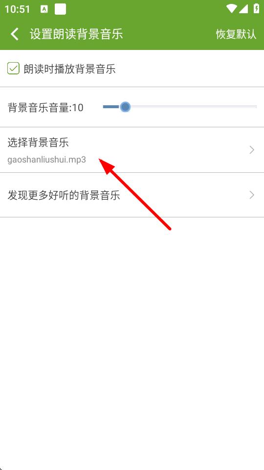 4、在设置朗读背景音乐页面,点击选择背景音乐,在可选项中挑选想要更换的背景音乐,即可完成背景音乐修改。