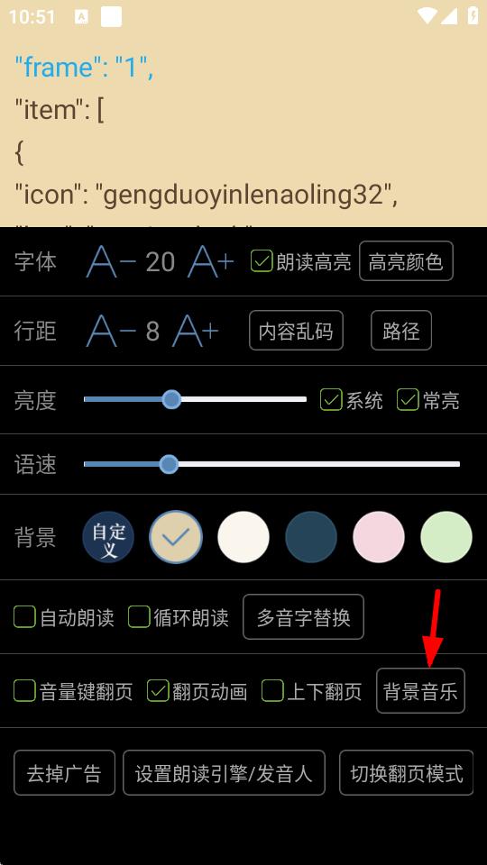 3、在设置界面里,找到并点击背景音乐选项,进入设置朗读背景音乐页面。