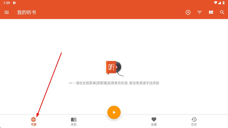 1、打开【我的听书】APP,进入主界面后,点击底部左下角的【书源】按钮,进入相关管理页面。