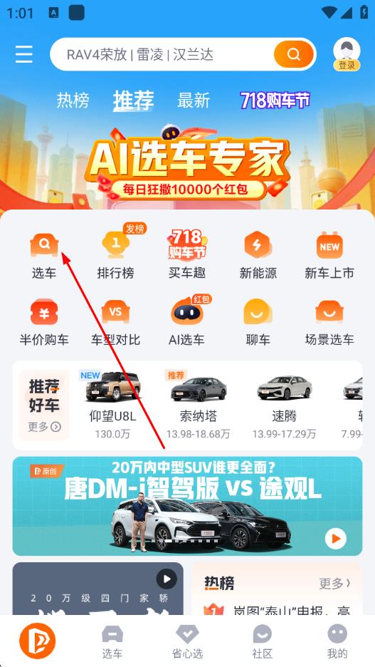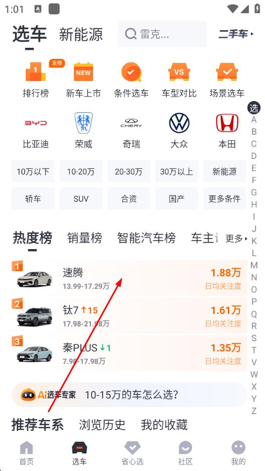 2、在选车页面,通过热度榜等找到目标车型,点击进入详情页。