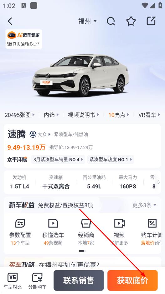 3、在车型详情页,点击右下方获取底价按钮。