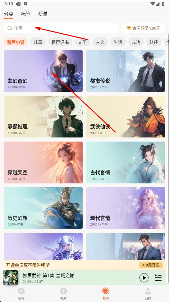 1、点击底部导航栏中的【找书】选项,进入找书页面,输入想听书籍的关键词,比如杀神,然后点击搜索按钮。