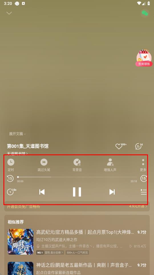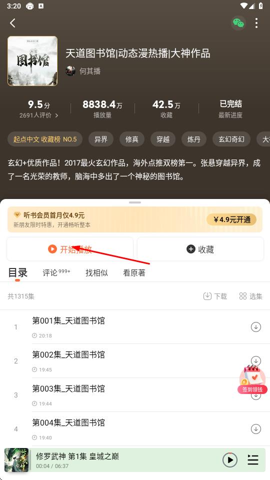 2、在搜索结果或分类浏览结果中,找到想收听的书籍,比如《天道图书馆》,点击进入书籍详情页。