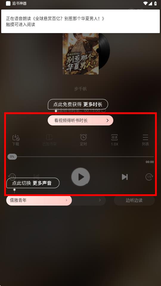 3、进入听书界面,可按需通过看视频获取听书时长,还能进行定时、倍速、切换声音等操作。