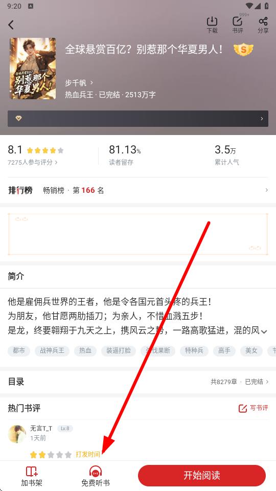 2、在书城选择小说,进入小说详情页后点击免费听书。