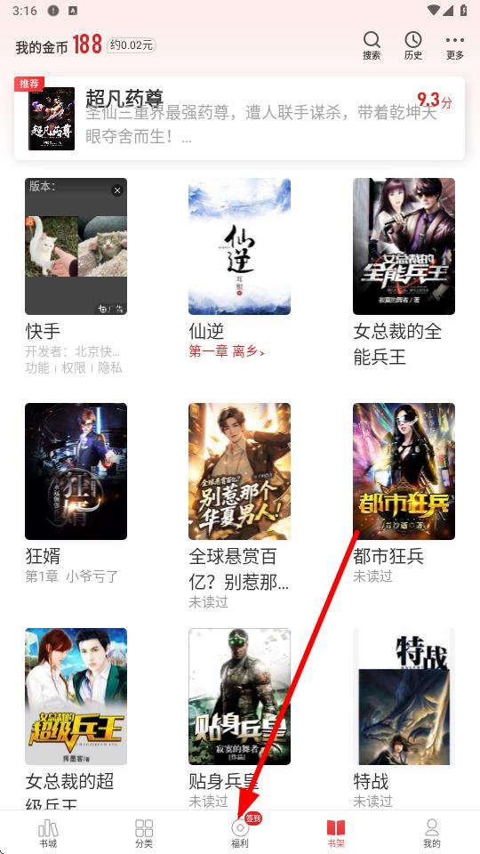 1、打开追书神器,点击底部导航栏中的福利选项。